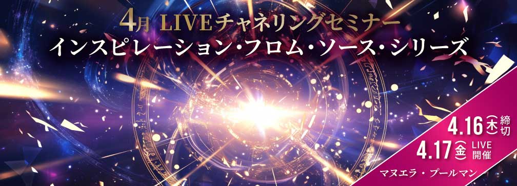 ◆【4/16(木)締切】4月LIVEチャネリングセミナー「インスピレーション・フロム・ソース・シリーズ」4/17(金)開催 ◆【4/24(金)締切】4月遠隔アクティベーション「ダンス・オブ・マネー・シリーズ」4/27(月)開催 ...