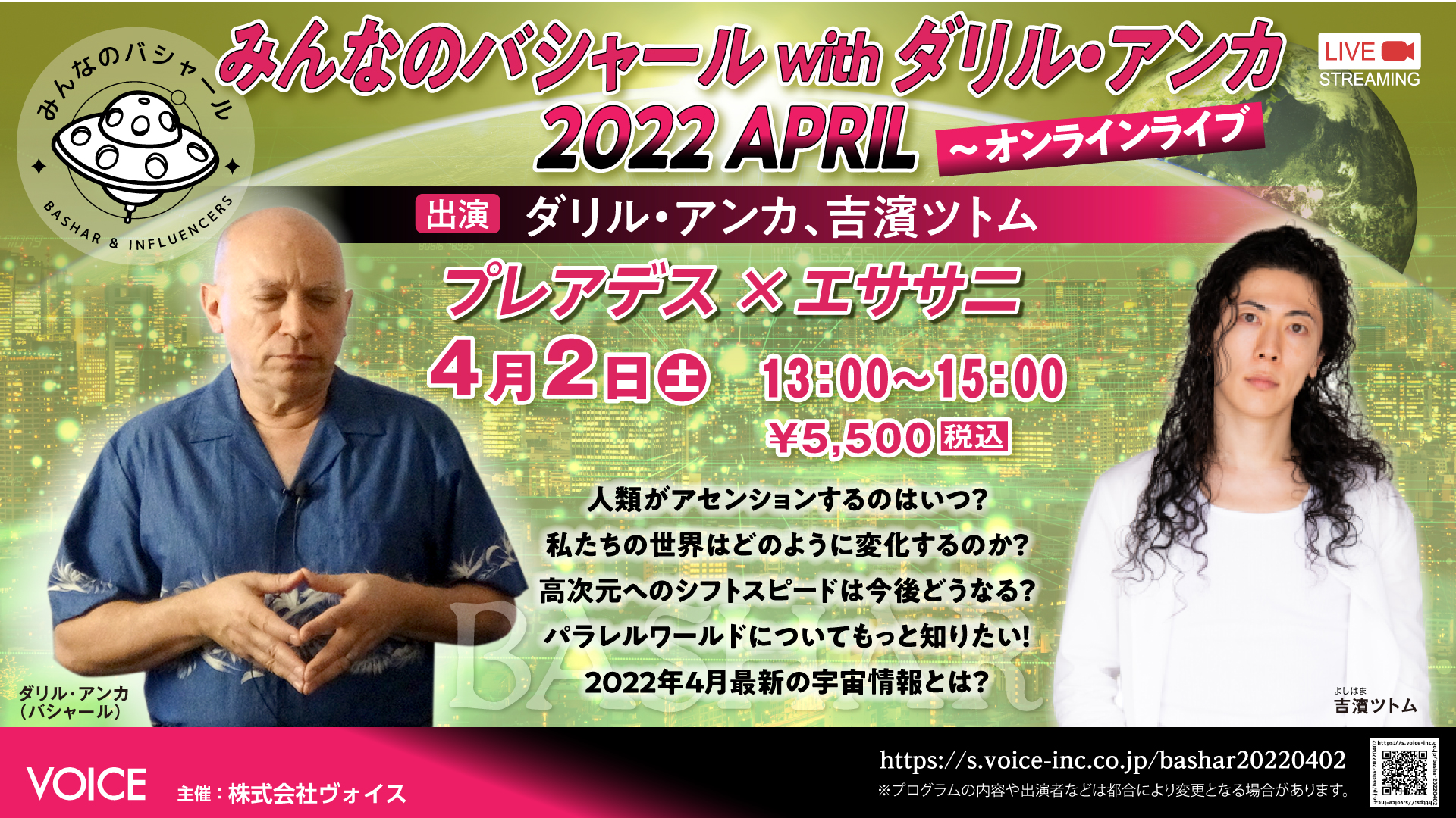 <イベント> 2022.04.02(土) 13:00〜 みんなのバシャールwithダリル・アンカ2022APRIL〜オンラインライブ 出演:ダリル・アンカ、吉濱ツトム