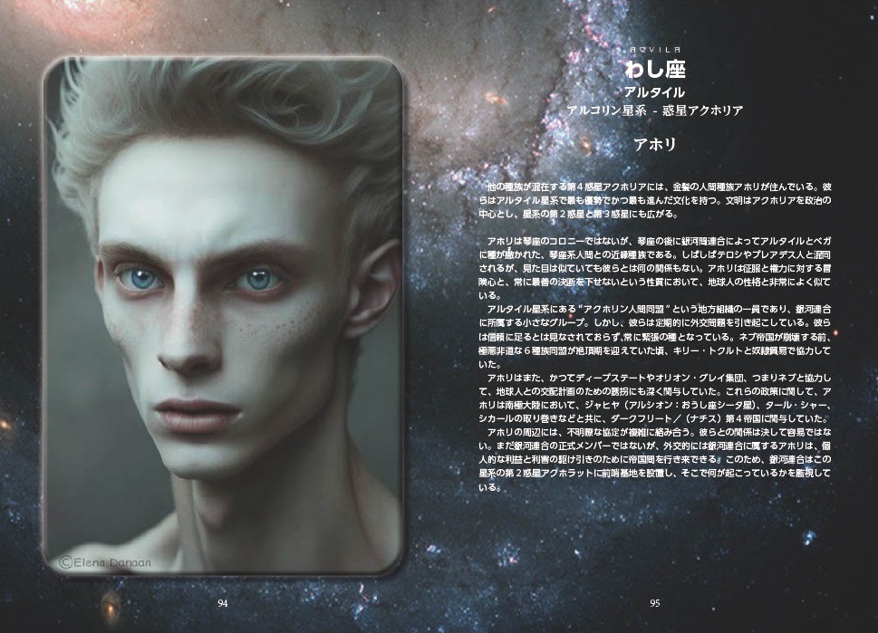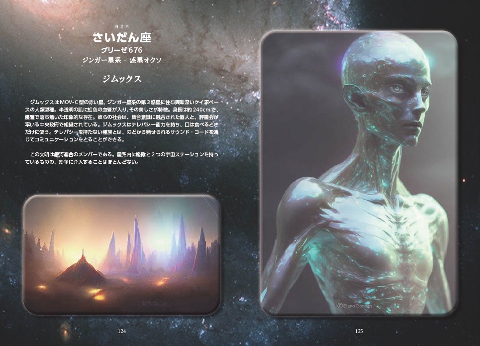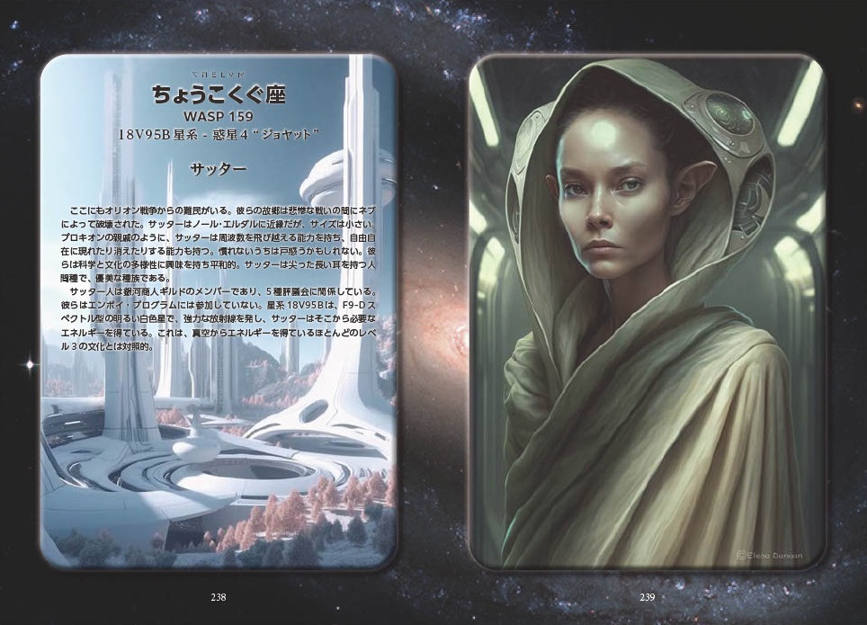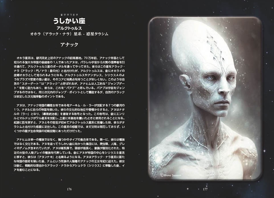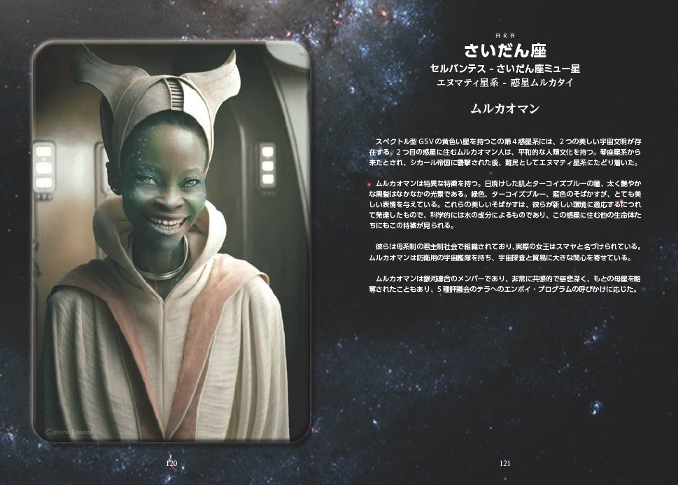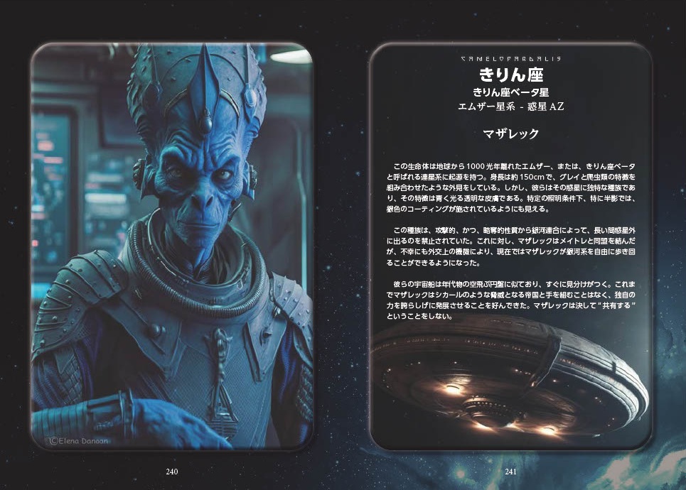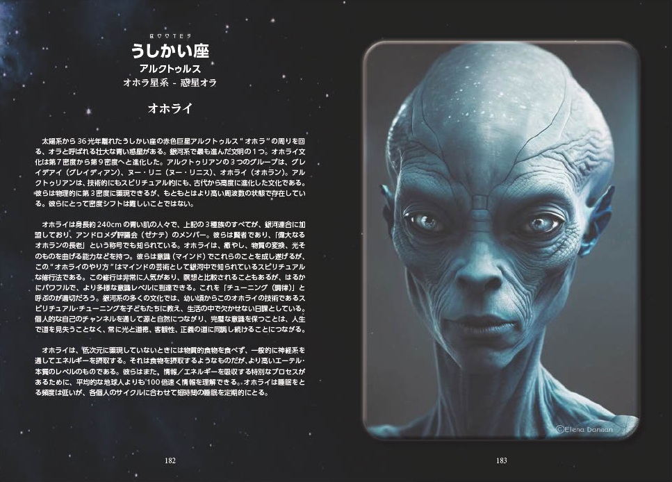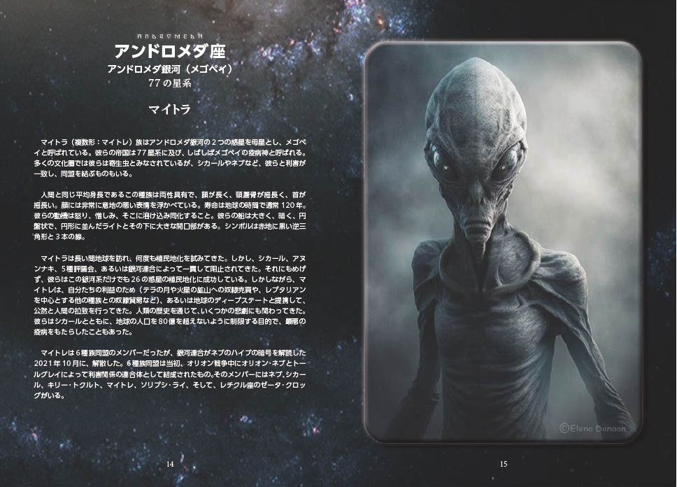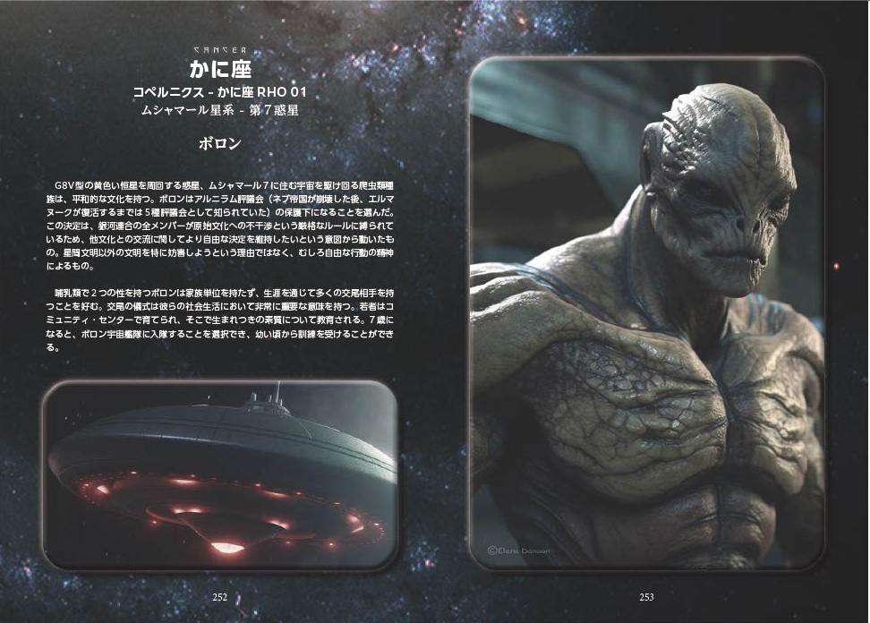 著者エレナ・ダナーン自身がコンタクトするソー・ハン・エレディオンから受け取った手描きの白黒画像をもとに、110種族をリストアップ。