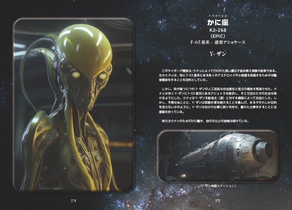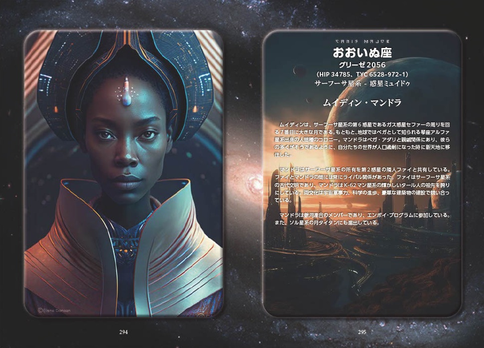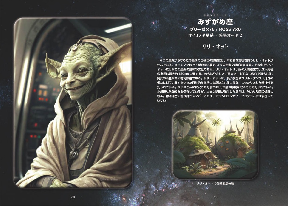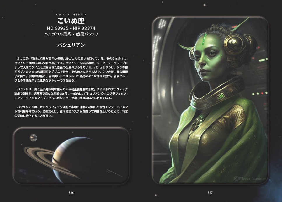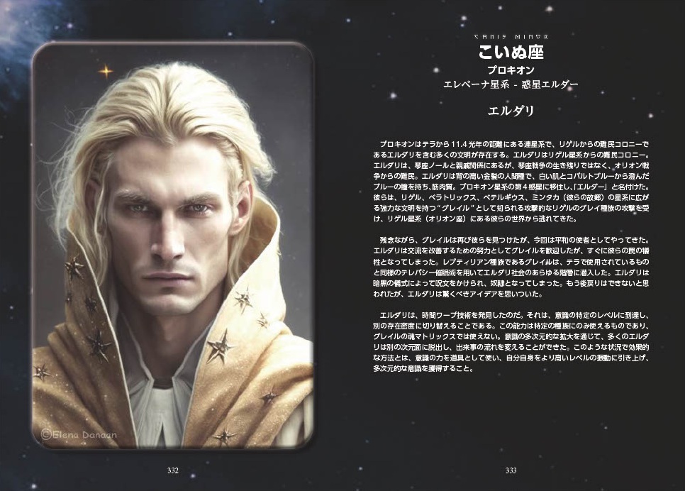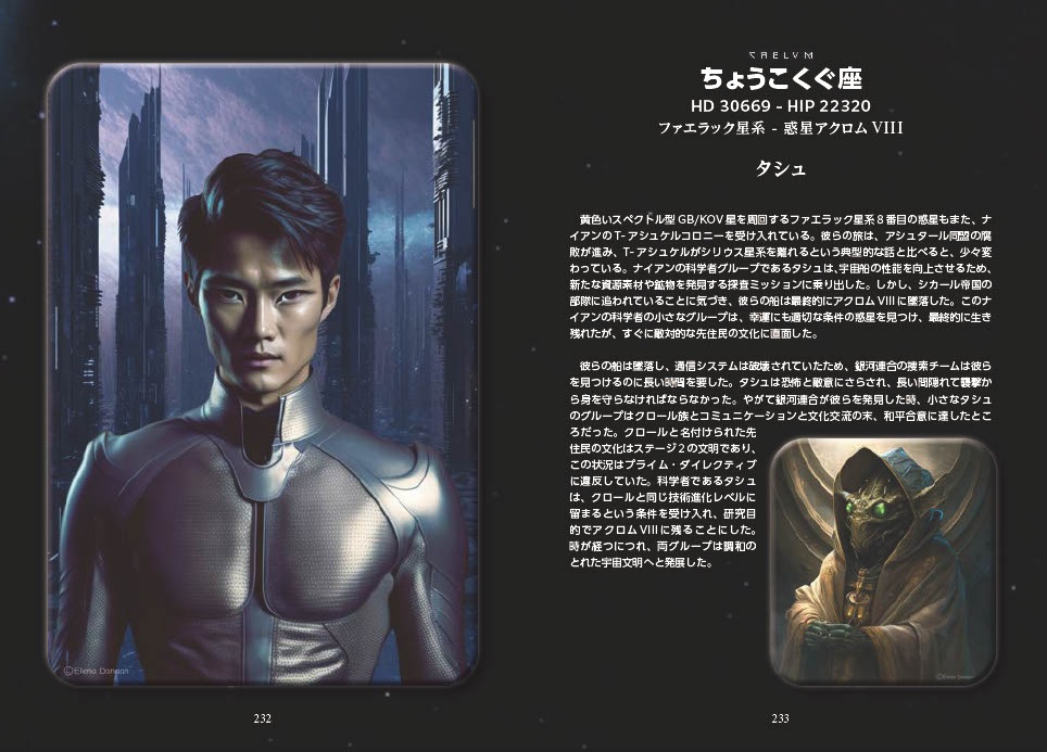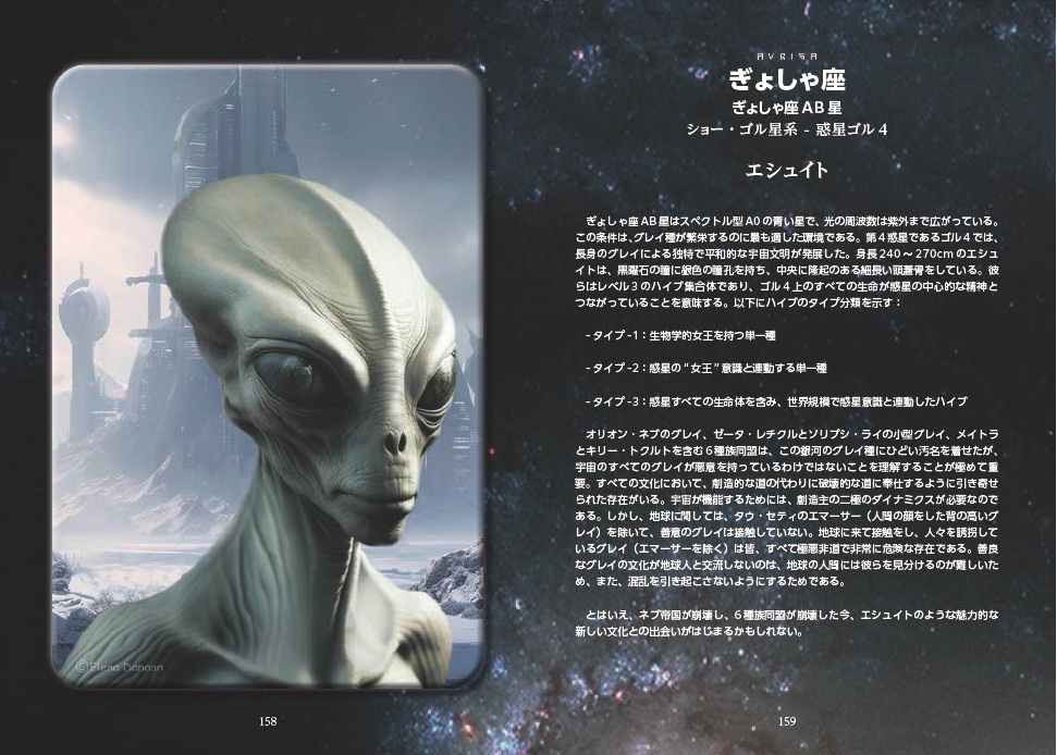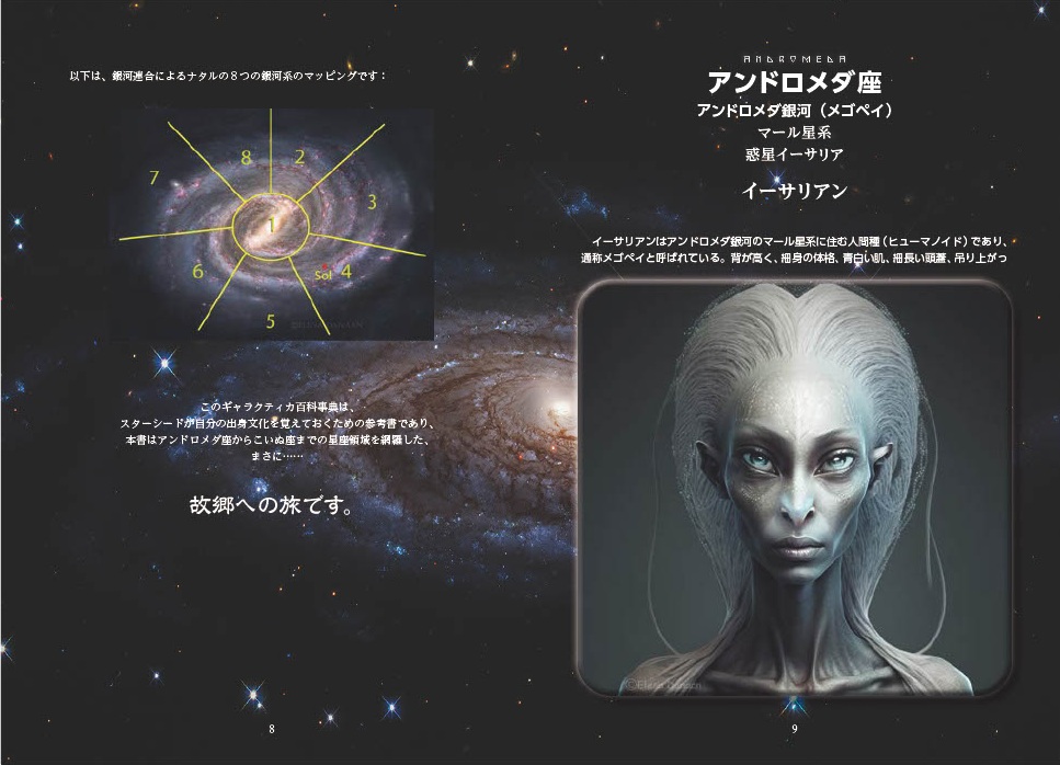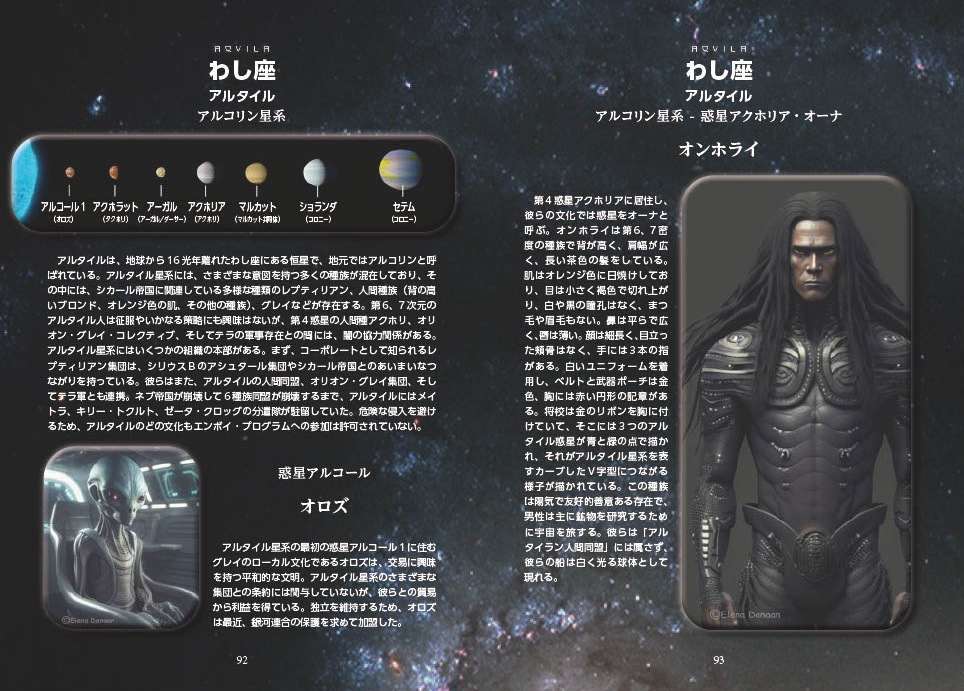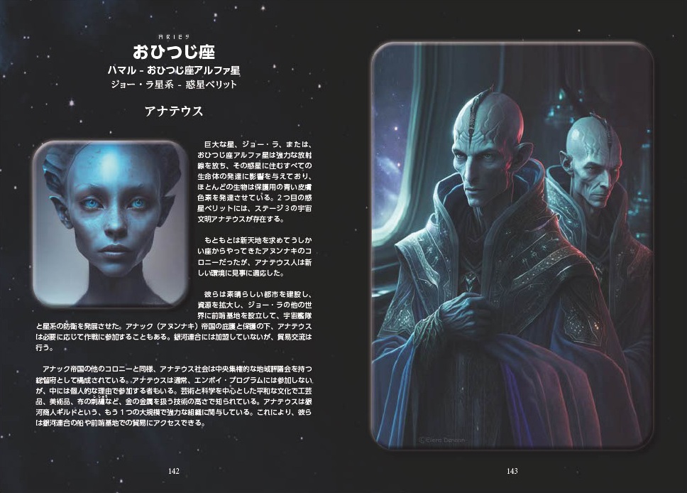 著者エレナ・ダナーン自身がコンタクトするソー・ハン・エレディオンから受け取った手描きの白黒画像をもとに、110種族をリストアップ。