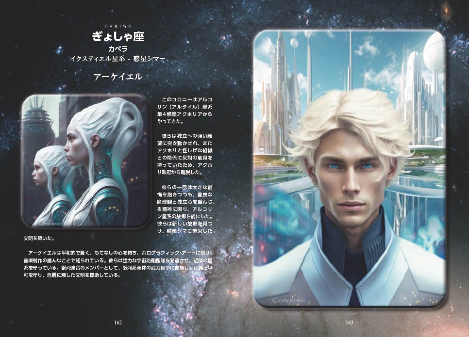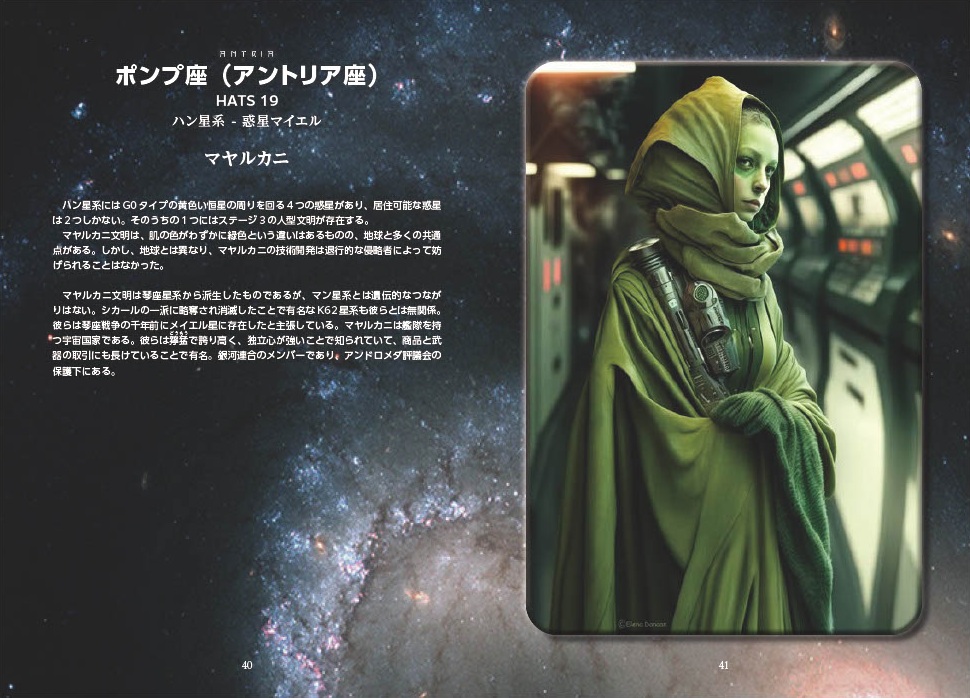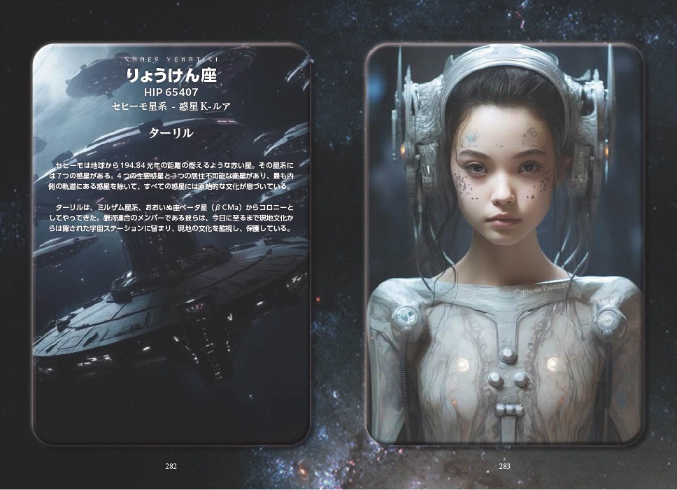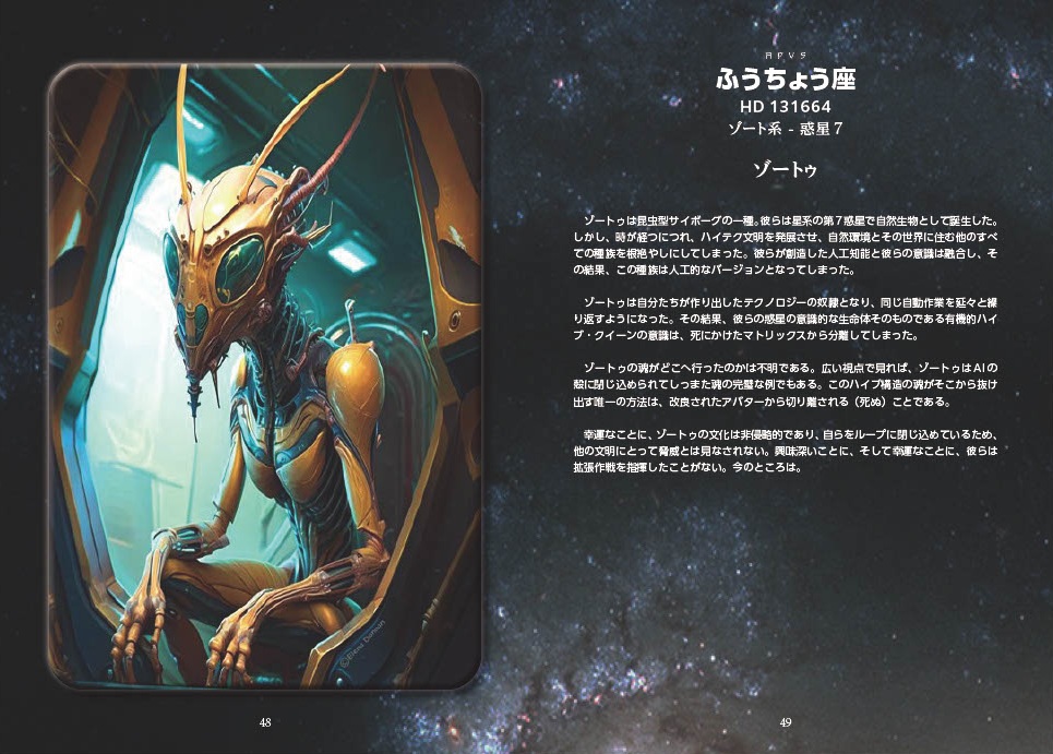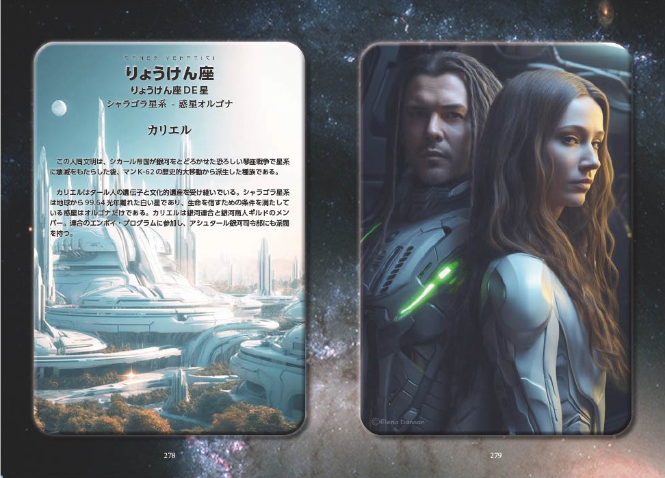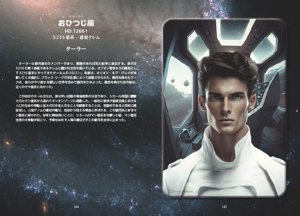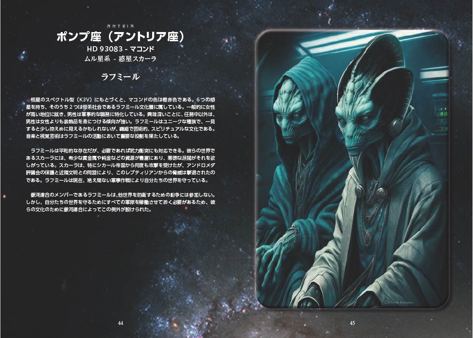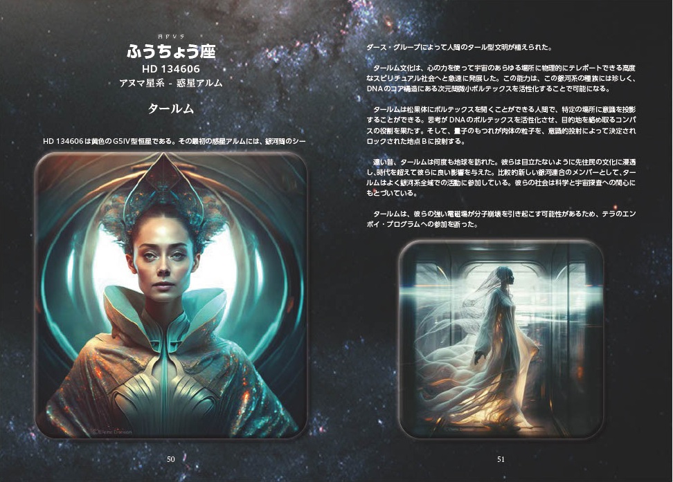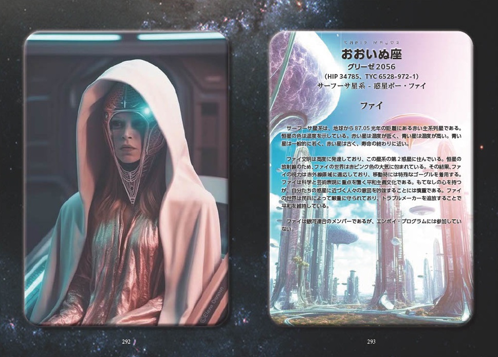 著者エレナ・ダナーン自身がコンタクトするソー・ハン・エレディオンから受け取った手描きの白黒画像をもとに、110種族をリストアップ。