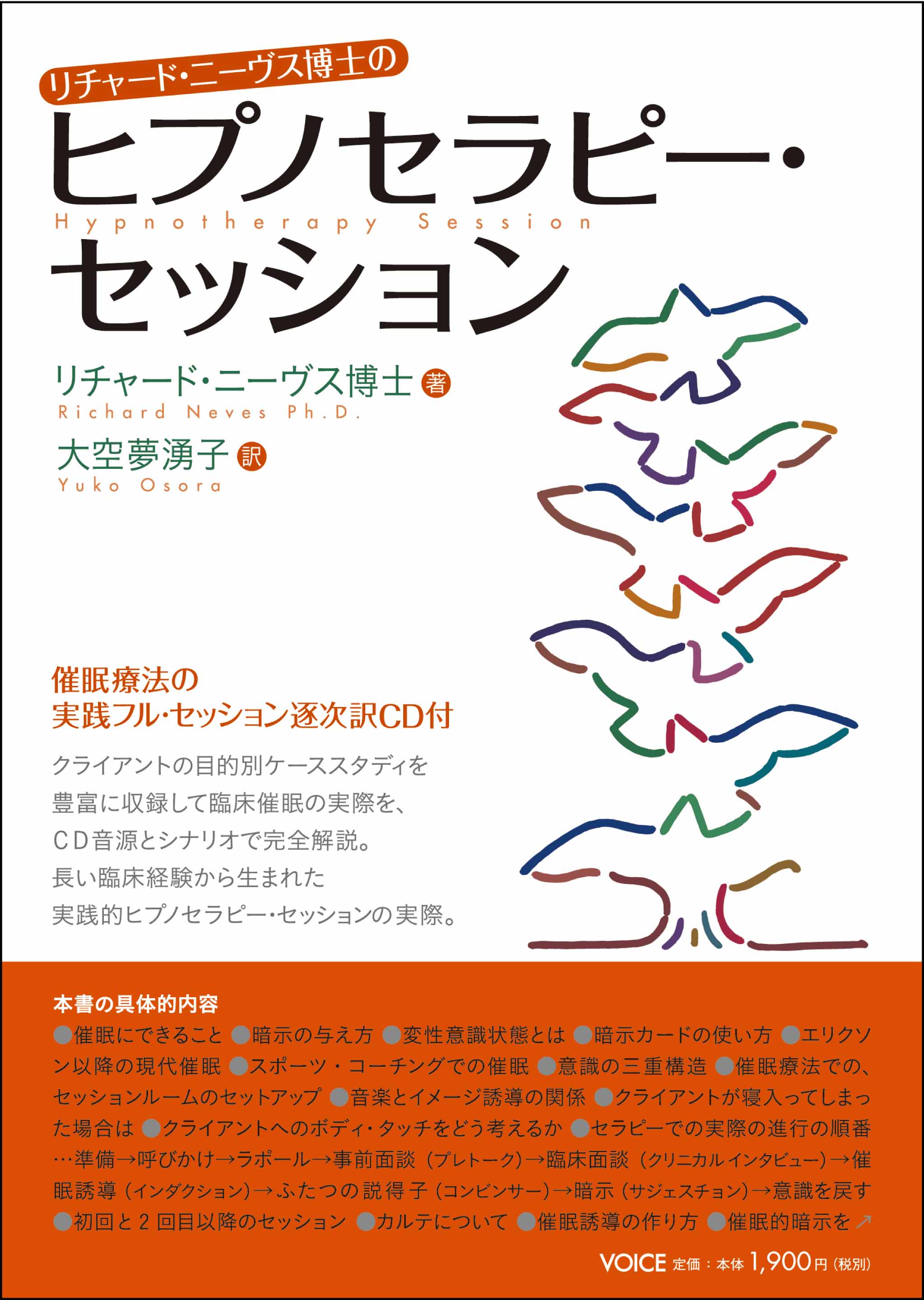昨今、特に注目されているヒプノセラピー。ヴォイスワークショップでも招聘し、日本でヒプノセラピストを養成し、米国では重要な催眠協会の理事や代表を歴任するニーブス博士が、長年の臨床経験に基づく、クライアントとの豊富な経験をもとに、具体的なセラピールームのセッティングから、各クライアントの目的別ケーススタディの具体的セッション進行までを具体的に語った書。通常の進行ではいかない、困難なケースも扱っています。しかも、書籍の方でいくつかの具体的誘導例を載せていますが、そのなかの一例を、最初から最後までスルーでCD音源として再現。ニーブス博士の具体的誘導を、ご本人の声+通訳さんの大空夢湧子さんの逐次訳で丸ごと収録しています。この本は、ヒプノセラピストをめざす方の副読本的な使い方と、ご自身のために催眠を使おう、という一般の方の両方を満足するように作られています。初心者からプロまで幅広く活用できる、「実用的な本」が切望される中、いよいよ今夏発刊されます!