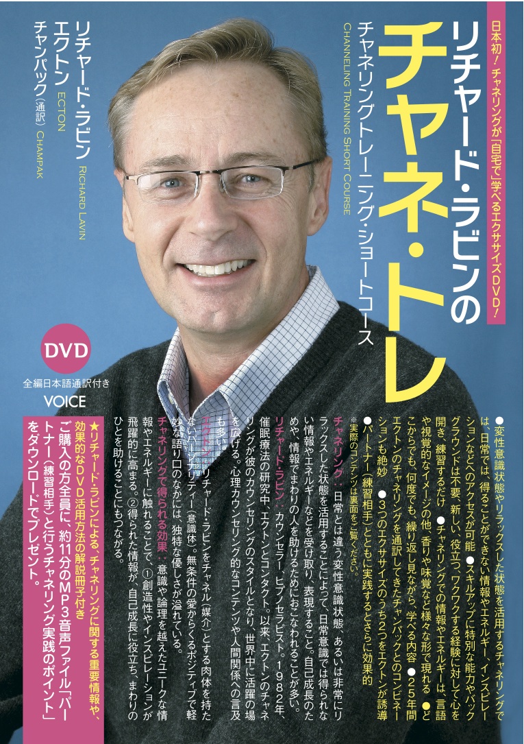 DVDの収録時間は約2時間ですが、あなた自身が自分のチャネリングのスキルを育むための、非常に内容の濃い情報やエクササイズが含まれ、チャネリングトレーニングの重要なポイントが集約されています。そしてさらにこのDVDには、リラックスした、普段とは違った意識の状態で行う3つのエクササイズも収録されています。エクササイズのひとつはリチャード・ラビン氏が誘導し、残りの2つはリチャード・ラビン氏がチャネルしたエクトンが誘導しています。
