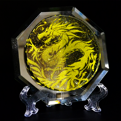 八角形の美しいクリスタルガラスに刻印された龍は、まるで宇宙の秘密を物語るかのように、見る者の心を引きつけます。その鱗片からは龍のパワーが感じられ、空間に神秘的な輝きとパワーをもたらします。