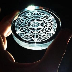 多層構造光彩魔法陣「The World」は、変調されていない自然な太陽光・月光を取り込むことでより強力に術式が作動し、最高のパワーを発揮します。そのために陣を刻む素材には、カメラや精密光学機器に使われる極めて透明度の高い最高品位のオプティカルクリスタルガラスを採用しています。スワロフスキーなどに使われる一般的なクリスタルガラスでも高い透明度を確保できますが、その透明度をあげるために人体にとって有害である鉛を含有しています。多層構造光彩魔法陣「The World」は、人と共にあり人に寄り添うものですので、安全性を確保しつつ透明度を実現した高価なオプティカルクリスタルガラス(エコクリスタルガラス)を採用しています。