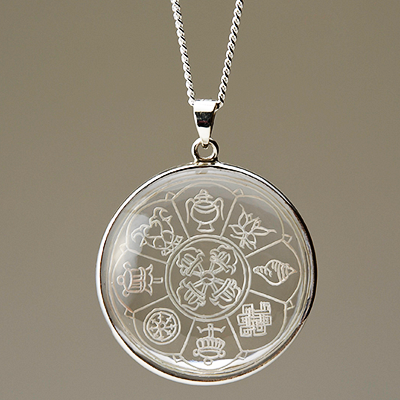 透明度・品質AAAランクーたいへん貴重で地上最強の力を宿す水晶である「ガネーシュヒマール産」のクリアを使用し、チベット密教の極致である八つのことわりを象徴する図形を彫刻した「八吉祥図(タシタゲ)」を全面に配し彫刻したペンダント。