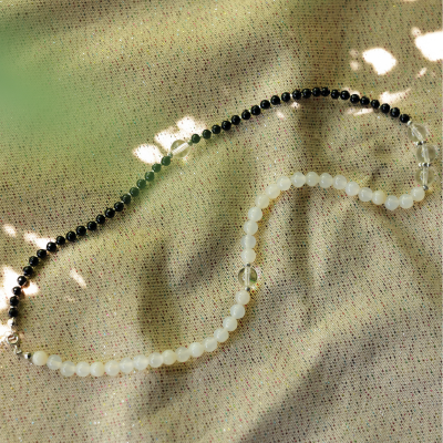 スパイラルクォーツの左螺旋のエネルギー、ブラック・オニキスの強力な守護と意志の力、ホワイト・カルセドニーの優しい癒しと調和の力が組み合わさることで、フィジカルな美しさだけでなく、精神的、エネルギー的にも多層的なサポートをしてくれるとても特別なアクセサリーです。