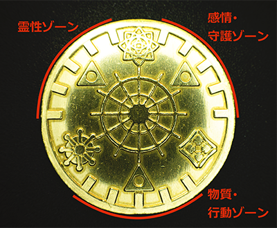 左上 ◆霊性ゾーン「天」に相当するゾーンで、高次の直感力や洞察力、思考・計画・啓示を意味する。 右上 ◆感情・守護ゾーン「心」に相当するゾーンで、家族・信用・人間関係などを意味する。 中央下 ◆物質・行動ゾーン「地」に相当するゾーンで、現金収入・成果・契約成立などを意味する。 |