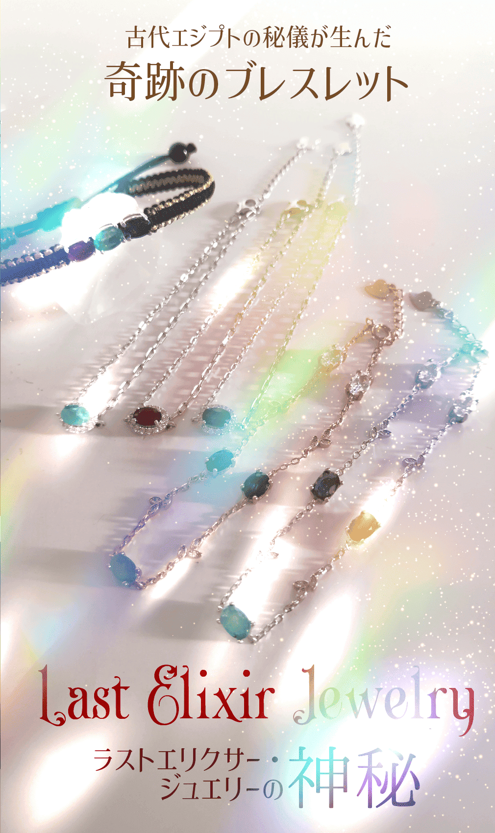 これらの「ラストエリクサー・ジュエリー」は、『ラストエリクサー』と同様、癒し・繁栄・魂の調和をもたらすとされています。