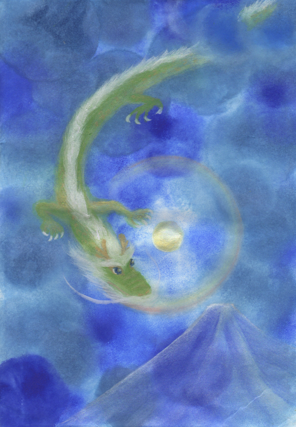 満月が静かにやさしく光り、雲の上から龍が現れます。