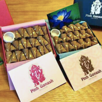 「ピンク・ガネーシャ香」は、ピンク、ネイビーと2種類あり、それぞれ素材の配合が違い、男性性と女性性を活性化されるようにつくられています。