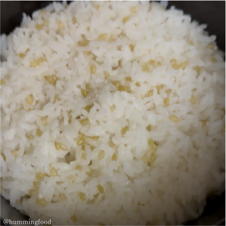 白米1〜1.5合に大さじ1杯の緑米を混ぜる。