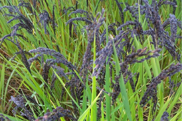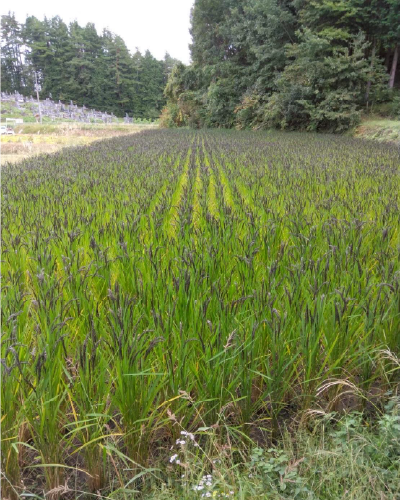 穂は深い濃紫色、玄米は淡い薄緑色。